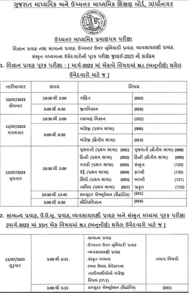 ધો.10 અને 12 ની પૂરક પરીક્ષાનું ટાઈમટેબલ જાહેર